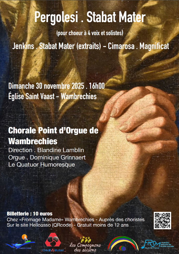 Le dimanche 30 novembre prochain, vous pourrez notamment apprécier le célèbre Stabat Mater de Pergolese, dans une version pour chœur et cordes. Venez nombreux à 16h à l’église Saint Vaast de Wambrechies !